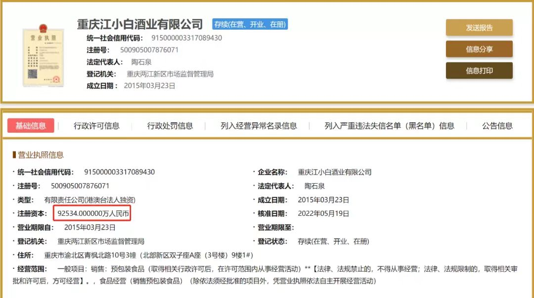 一笔近4亿的巨额增资也说明了资本对于江小白的肯定。天眼查5月23日显示,重庆江小白酒业有限公司注册资本增加,从5.75亿元增加到9.25亿元,增幅达60.83%。