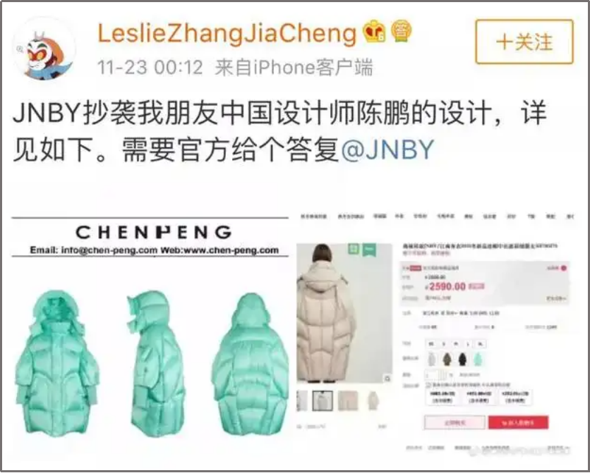 而恰好,这期间整个集团出现了研发设计上的问题。jnby by JNBY之外,JNBY一款羽绒服和一款凉鞋,速写一款包袋等产品,都被网友发现是涉嫌抄袭作品。