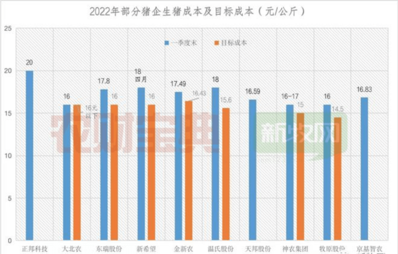 头部猪企今年也致力于降低养猪成本。从部分养殖企业公开的完全成本来看,2022年一季度,各大养殖企业成本在16-18元/公斤之间,以全国平均猪价来看,即便猪价向好,这样的成本水平依然处在盈亏线下,没有来到盈利区间。