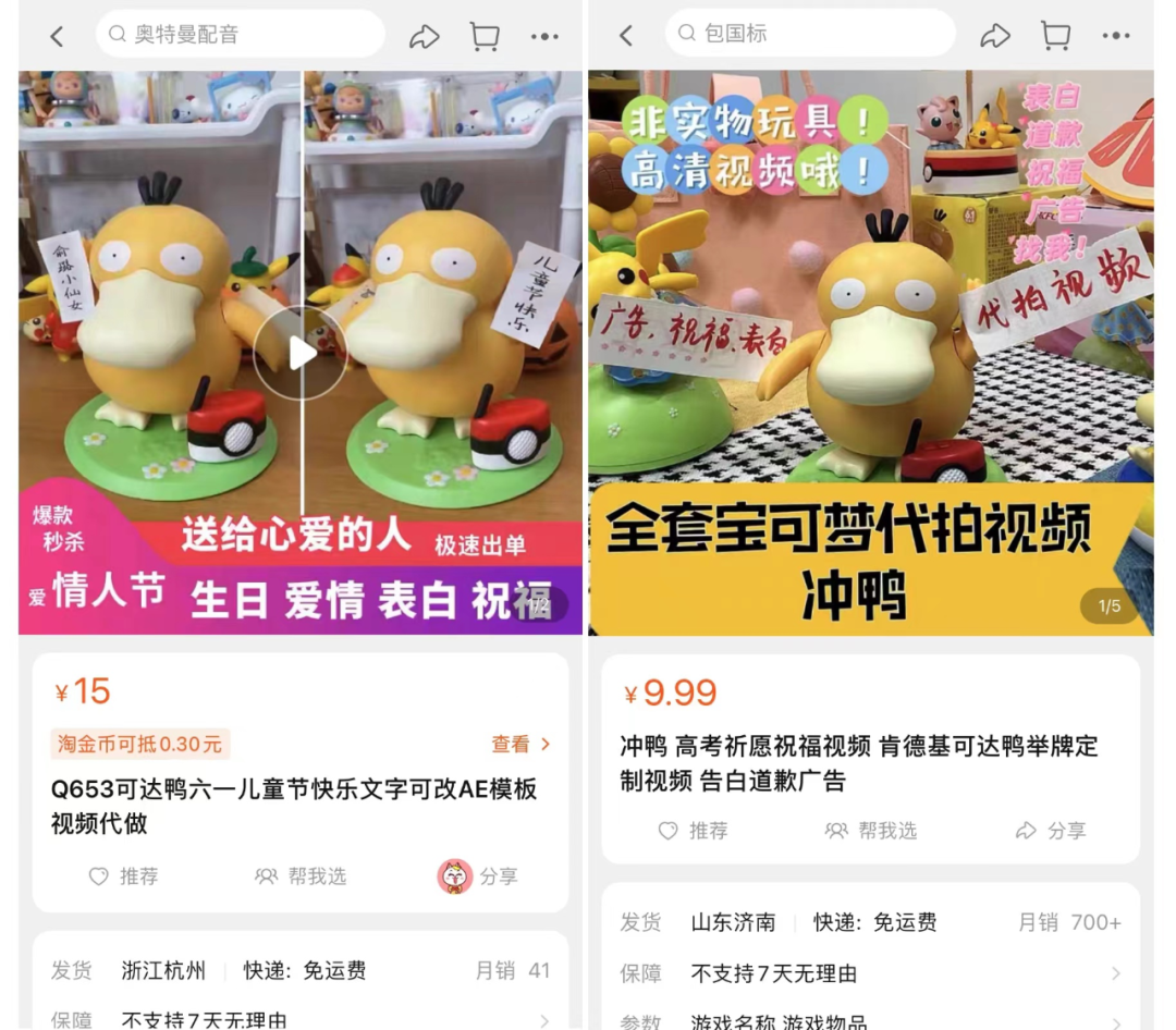 “尤其对于希望把可达鸭作为直播间作为赠品的带货主播们,会花几千块买一个正版的可达鸭,而在后续给消费者的赠品中便用山寨产品充数。”