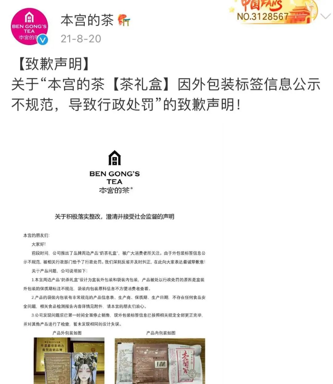 2021年8月,本宫的茶因违反食品安全相关条例,被广州市番禺区市场监督管理局罚款4万元。8月20日,本宫的茶在其官方微博发布声明,对大家表达歉意。声明称,产品被处罚的原因是盒装外包装的保质期标注不规范,袋装内包装原料信息不方便消费者查看。但是产品袋装内包装有规范的产品信息表、生产商、保质期、生产日期,不存在任何食品安全问题,现外包装标签信息已按照相关规定全部更换完毕。