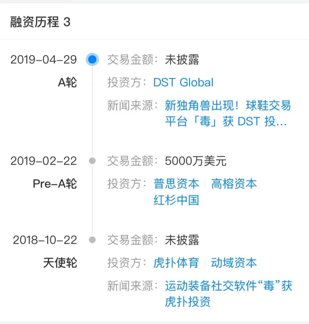 据天眼查App信息显示,成立7年的得物共获得三轮融资,其中,2018年10月,得物获天使轮融资,投资方为虎扑体育和动域资本;2019年2月,得物获5000万美元Pre-A轮融资,投资方为普思资本、高榕资本和红杉中国;2019年4月,得物获A轮融资,投资方为DST Global。