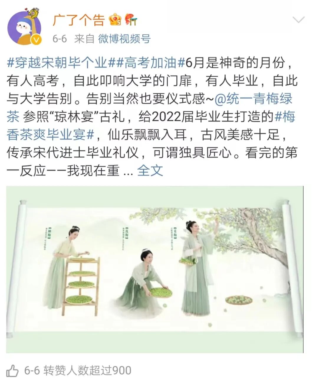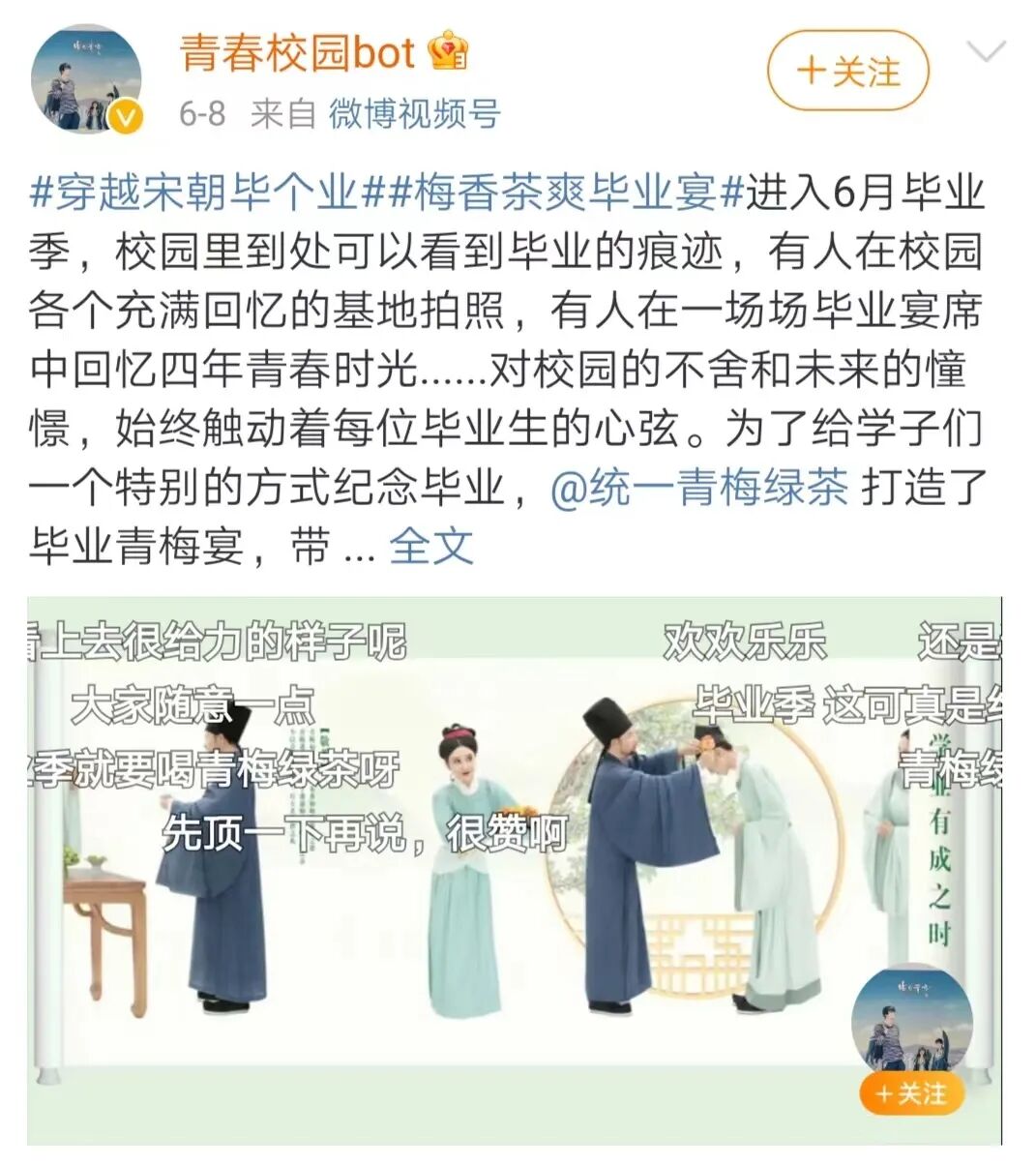 穿越文人墨客云集的北宋,办一场颇有仪式感的“青梅宴”,让现代学子们体验一把古人的毕业仪式,统一青梅绿茶这场国风范十足的毕业季营销,可谓赏心悦目,惊艳万分,打出了自己的差异化风格,提高了品牌在年轻圈层的知名度和美誉度。01