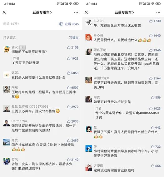 现在看来,五菱“地摊神车”的刷屏可谓品牌热点营销的典范,在大众注意力稀缺,流量越发昂贵的当下更值得分析与探究。众所周知,因为总理的点赞,使得“地摊经济”在经济复苏的当下成为全民热点话题。此次,《五菱翼开启售货车——地摊经济的正规主力军!》正是借助“地摊经济”这个全民杠杆,以“摆摊神车”为沟通支点,完成了与大众对话沟通的基础铺垫。当大家都在讨论摆摊卖什么、怎么摆摊等话题的时候,五菱以“摆摊神车”的姿态进入大众的视野,既给真正需要摆摊的人提供了一个“摆摊”解决方案,也给网友们提供了一个可供传播的谈资。正是立足于深层次的现实洞察,将全民热点“摆摊经济”与“摆摊神车”巧妙联系起来,迅速拉近了与大众之间的心理距离,由此获得了大众的深度共鸣。2、“接地气”品牌形象,与“地摊经济”CP完美契合诚然,好的热点营销,不仅需要创意十足还要和热点贴合的“天衣无缝”让人拍案叫绝,不仅不会被人嘲笑蹭热点还让人眼前一亮。就拿五菱汽车来说,可谓和“地摊经济”是天造地设的CP。众所周知,五菱汽车因其在劳动人民生活中的用途广泛,早早获得了“神车”的美誉,天然的具有“接地气”的品牌形象。而此次的热点话题“地摊经济”同样是“烟火气”、“接地气”的代名词。在这个过程中,五菱有着十分突出的卖点与地摊经济营销点可以相结合。无论是五菱品牌与话题的契合度还是关注群体来说,他们都有着非常高的CP感。3、“人民需要什么,五菱就造什么”,话题梗以社交货币蓄势引爆不知道大家注意到没有,五菱此番“地摊神车”话题的引爆同样是基于“人民需要什么,五菱就造什么”话题梗。对于这句话,相信大多数人都不会陌生。在疫情初期,口罩作为主要防护用品,简直一罩难求!而国货之光五菱,霸气地喊出一句口号,“人民需要什么,五菱就造什么”。前后不到15天的时间,五菱挺身而出制造口罩这一义举,被央视新闻点名表扬,获得了老百姓的认可和点赞,一度引爆话题。“中国汽车之光”、“下一辆车就买五菱”等对五菱品牌的信任······网友好感度up,社交口碑不断输出扩散。而此次在全民“地摊经济”的当口,五菱以“人民需要什么,五菱就造什么”的口号再次出现,自然触发了网友们对此话题梗的记忆感知。从而延续了“口罩”抗疫的品牌好感度,经过网友们的二次演绎,以“社交货币”的姿态再次霸占了网友们的朋友圈、微博。