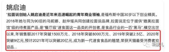 他们对外讲过很品牌故事,例如天猫拉面销售TOP1、全网热销5000万+……自称为食品行业黑马,2017年销售额突破1500万元、2018年突破8000万元、2019年突破2.5亿元、2020年突破9亿元,预计2021年销量突破20亿……