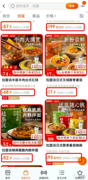新腕查询拉面说天猫旗舰店产品销售情况,选定“销量”排序。排名前列的商品销量,均未过万,销量第一的“日式叉烧泡面”,售价57.9元-62.9元3盒,按照销量8000计算,这款面会有50万左右销售额。打开界面,显示月销1万+,按照1万件计算,这款面单月销售额60万左右。