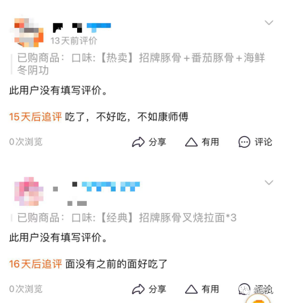 再看淘宝上,也有不少用户评价“吃了,不好吃,不如康师傅”、“面没之前好吃了”……