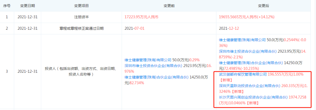 从企查查搜索可以看到,维小饭的运营公司——深圳市维士智慧健康管理有限公司曾于去年12月底获得新一轮资金注入,出资方包括长沙天图兴周创业投资合伙企业(有限合伙)、武汉御都府餐饮管理有限公司、深圳天星跃动投资合伙企业3家企业。