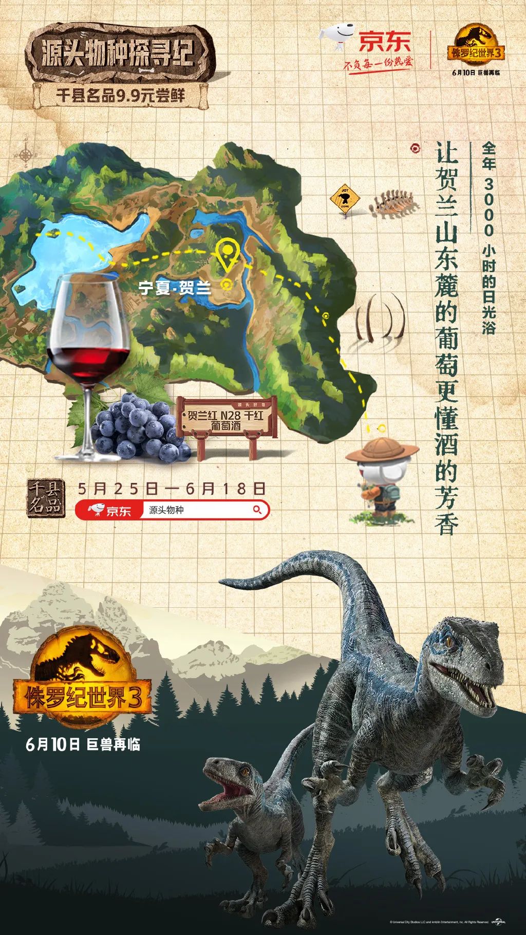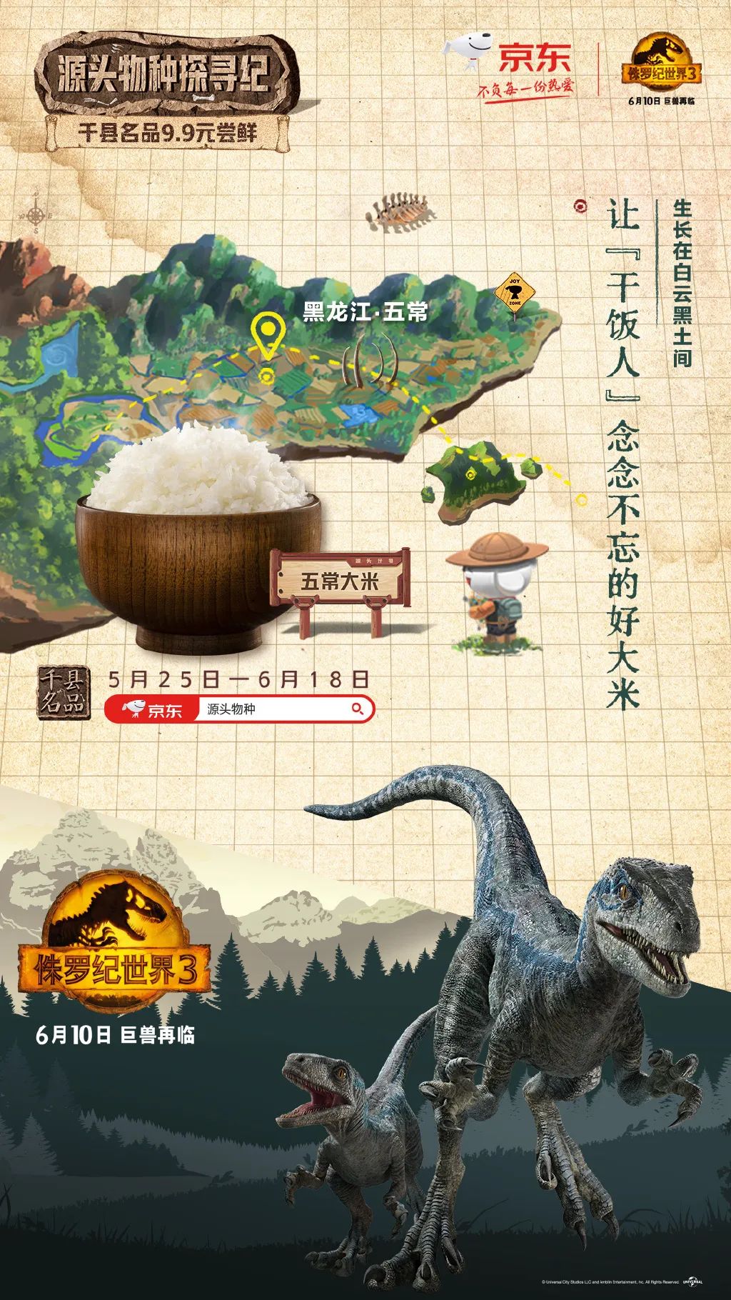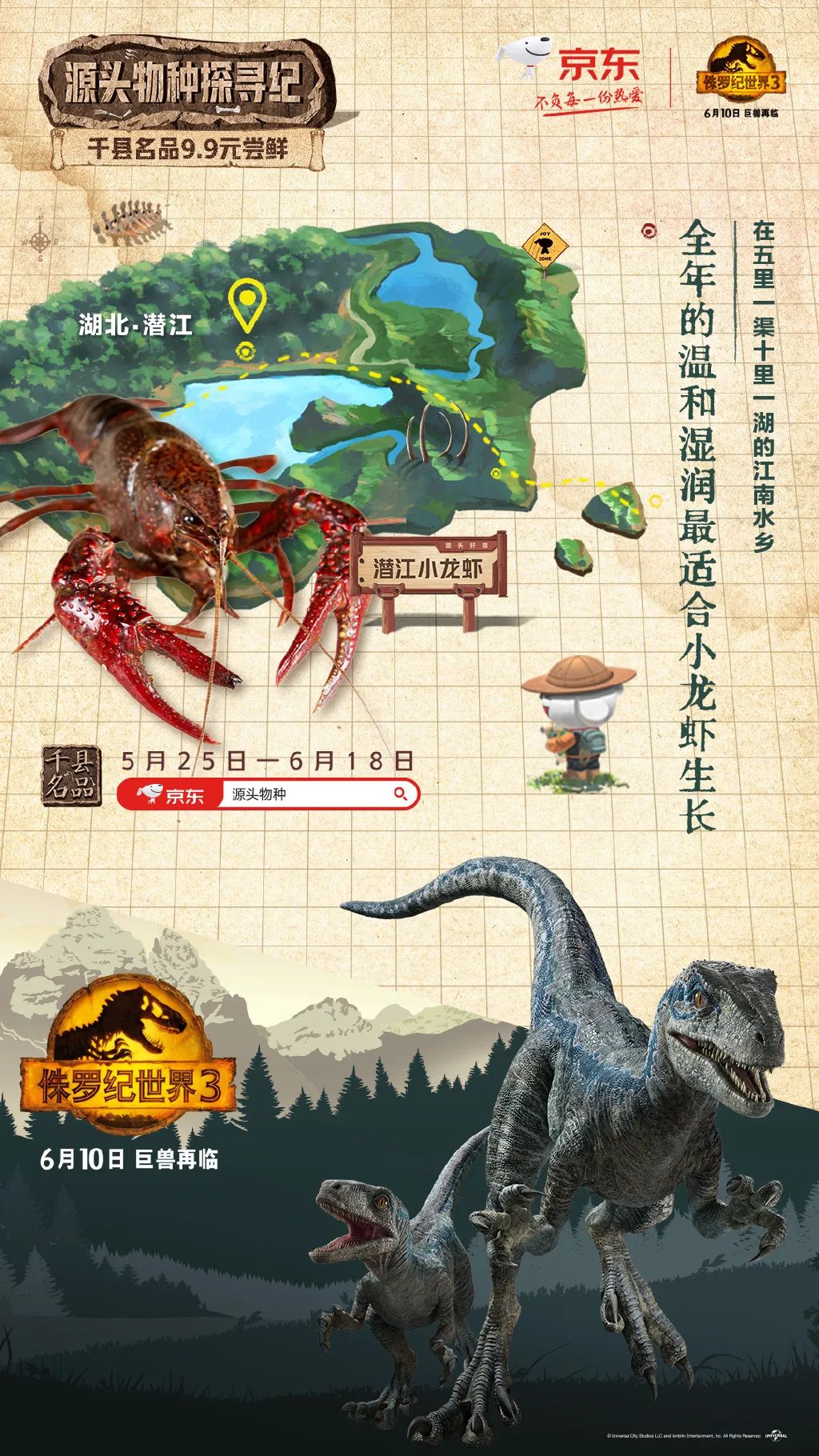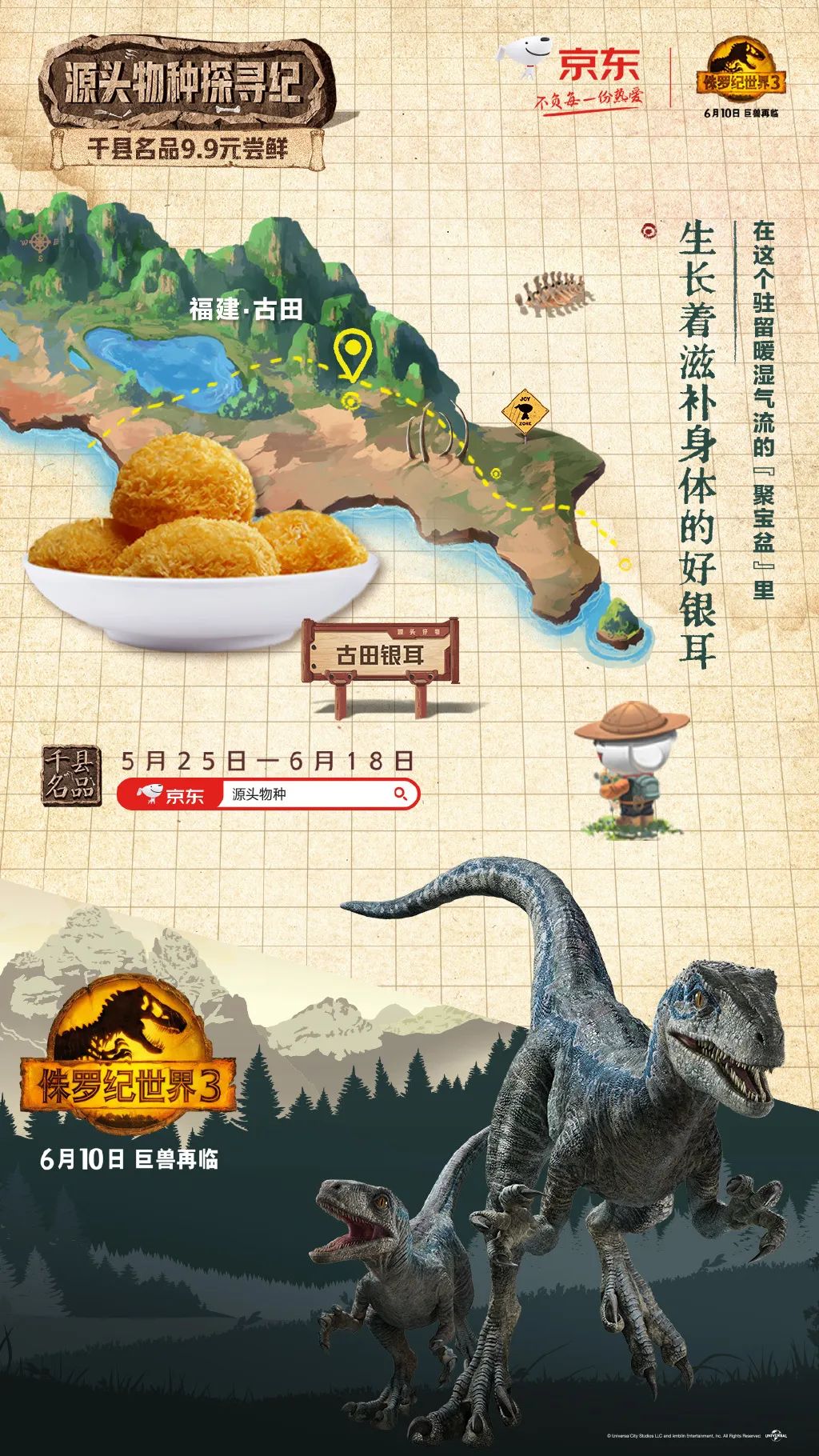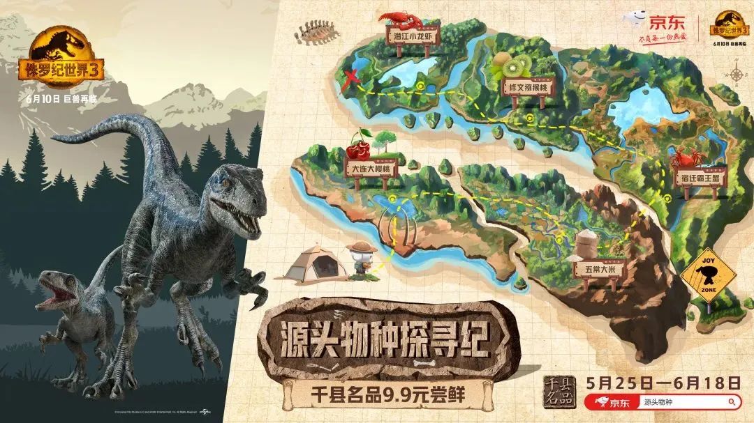 京东借势《侏罗纪世界3》,用“源头物种”串起恐龙霸主和地域代表美食的联系,深入挖掘两者的共性特征,在侏罗纪美食地图中充分展示源头产地的优势,引出最富特色的地域产品,加深用户对全国千县源头好物的认知。