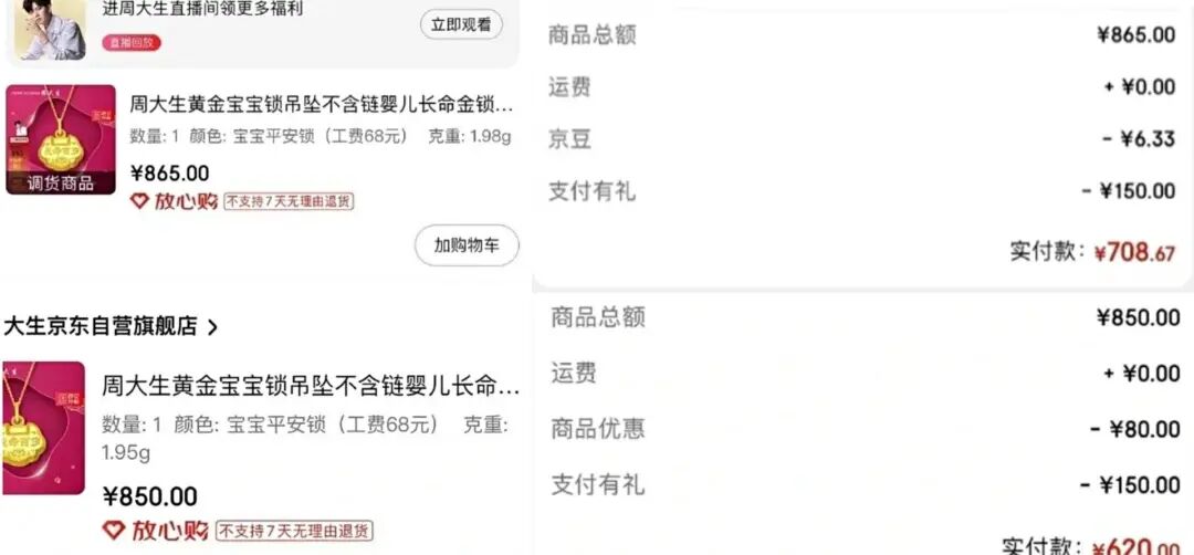 今年京东还出了专门的“618珠宝百亿补贴”,除了满500元减150元的平均优惠,还能抢80元的优惠券。而在深圳地区,周大生等品牌还有150元的消费券。