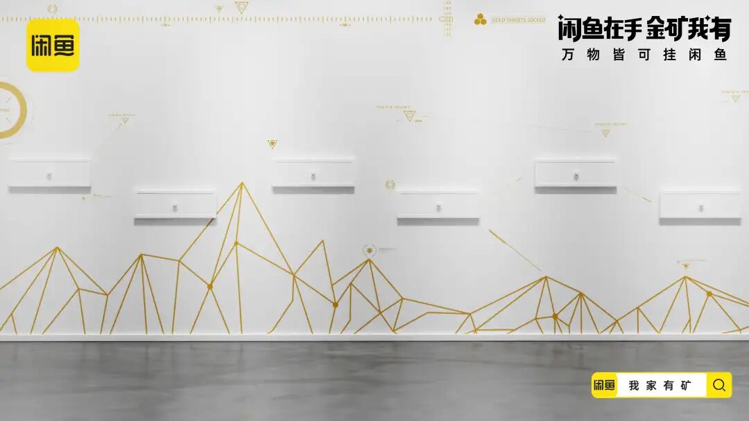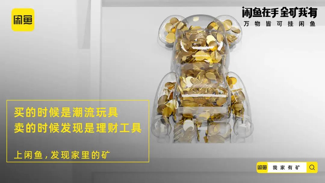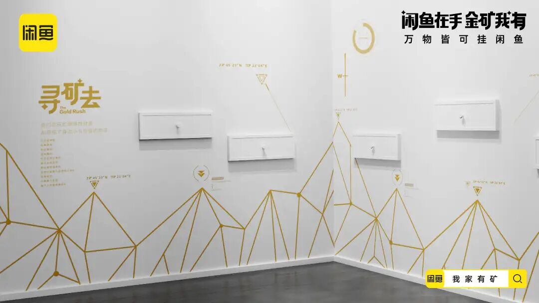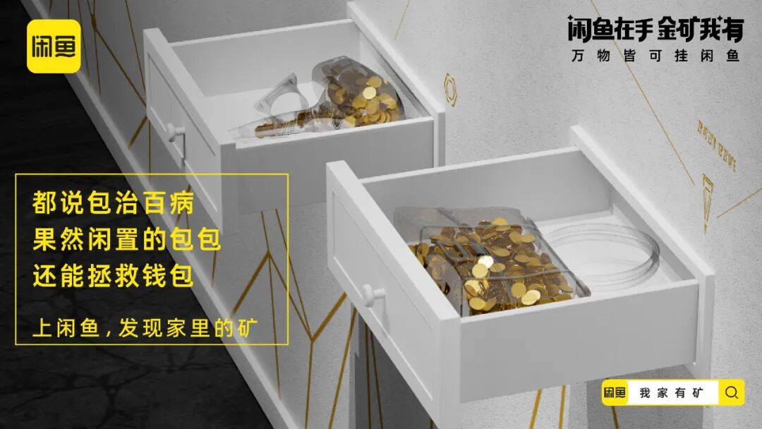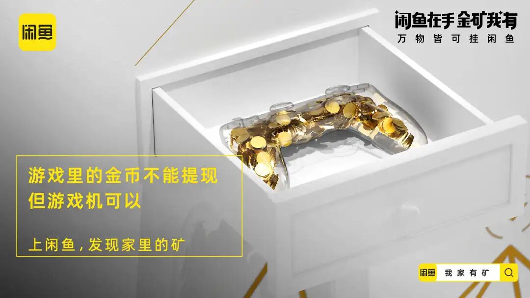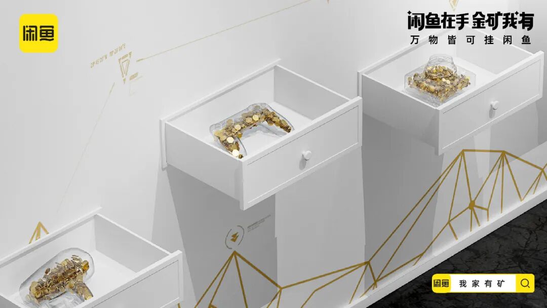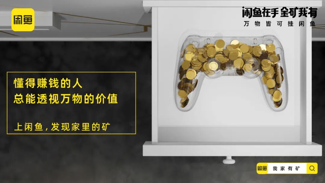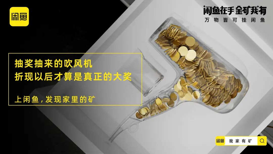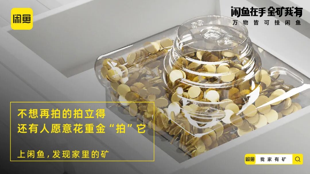 延续寻矿视频的内容画风,闲鱼还贴合年轻人的社交语境,推出了一组金句海报,把“金矿我有”打造成社交货币,进一步加深“闲置的宝贝其实是未被发现的金矿”的记忆点。在线下闲鱼打造寻矿体验装置,玩家只要打开装置就会发现,由透明器皿制成的物品堆满了金币。闲鱼利用生动化的互动设计,把闲置物品贴切类比为小金矿,增强了年轻人体验“寻矿”的代入感。配合站外的话题传播,闲鱼将站外传播与站内落地相结合,站内上线“我家有矿”的活动页面,激发消费者发布闲置物品的兴趣,打通流量到转化的营销链路。在新消费时代,对于这届年轻人来说,花钱变挣钱才是硬道理,他们一方面舍得为兴趣买单,另一方面也可能看重点外卖有没有红包,网购能不能包邮等省钱消费。基于年轻一代的消费观洞察,闲鱼通过一本正经的幽默操作,多维营销触点建立“寻矿”的场景,展示闲置物品秒变宝藏的过程,带领年轻人重新审视闲置的价值,从侧面呼吁大家上闲鱼卖闲置赚钱,进而夯实「万物皆可挂闲鱼」的业务心智。02