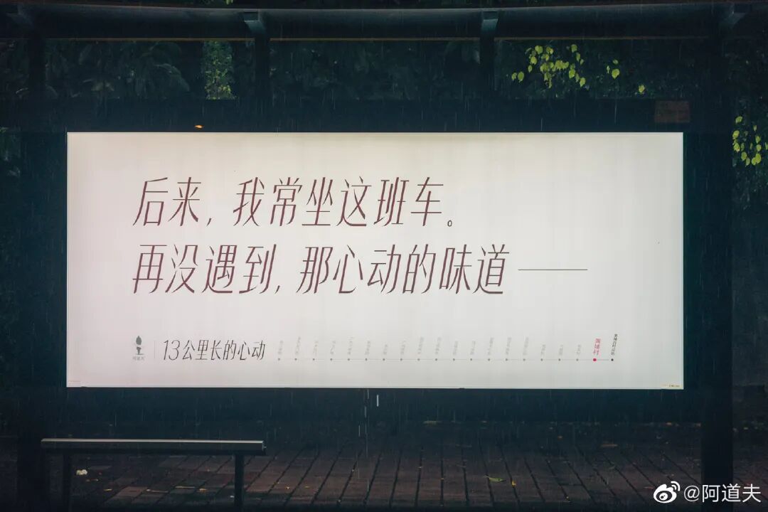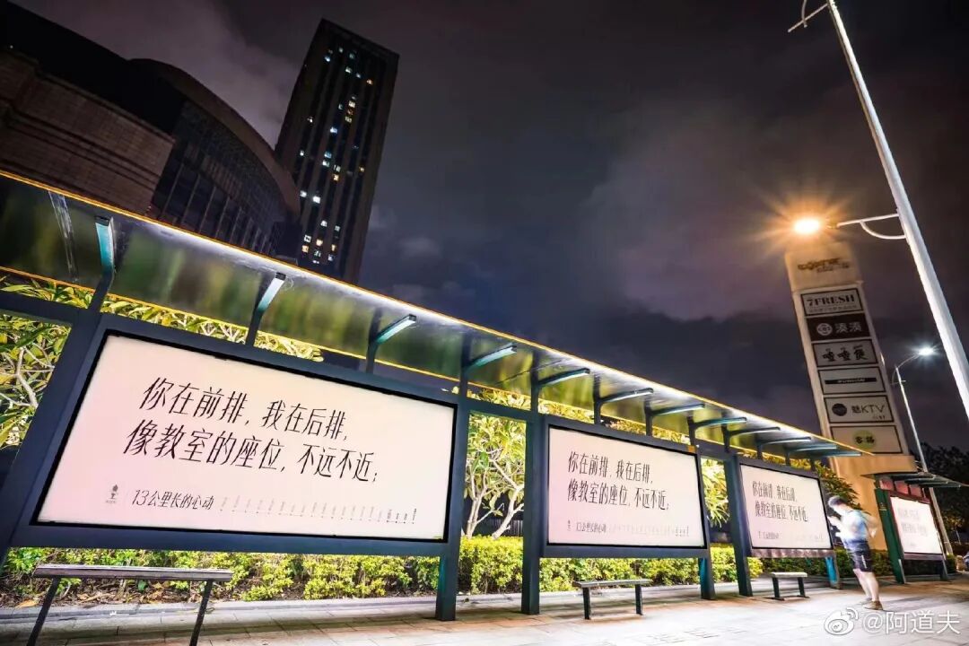 如果说海尔空调解决的是呼吸问题,那么阿道夫则是聚焦距离的问题。对于身处疫情时代的每个人来说,保持社交距离是一个不成文的规定。再者,这几年互联网的高速发展、智能手机的普及,朋友圈也好微博也罢,看似代替了人与人之间的交流,但在某种程度上却阻隔了人心与人心的距离,冷却了人与人之间的温度。不知不觉中,我们成了名副其实的网友,逐渐遗忘记了人与人之间的温度,忘记了怦然心动的感觉。基于社交关系的疏远洞察,阿道夫以心动为名,以公交为媒,锁定广州黄埔古村总站到珠江泳场站的站台,通过公交广告投放的落地形式,讲了一个心动的故事。一个公交站台,是一句文案、一个故事;20个站台,也能串成1个心动故事,像极了连载言情小说。阿道夫勾勒出一幅13公里心动图鉴,营造了“从前的日色变得慢,车,马,邮件都慢”的唯美意境。值得一提的是,阿道夫并没有停留于线下的投放,还从线下转移到线上,把公交创意搬进视频里,抛出“你的心,还会动吗?”的问题,引发我们对于心动感觉的深思。
