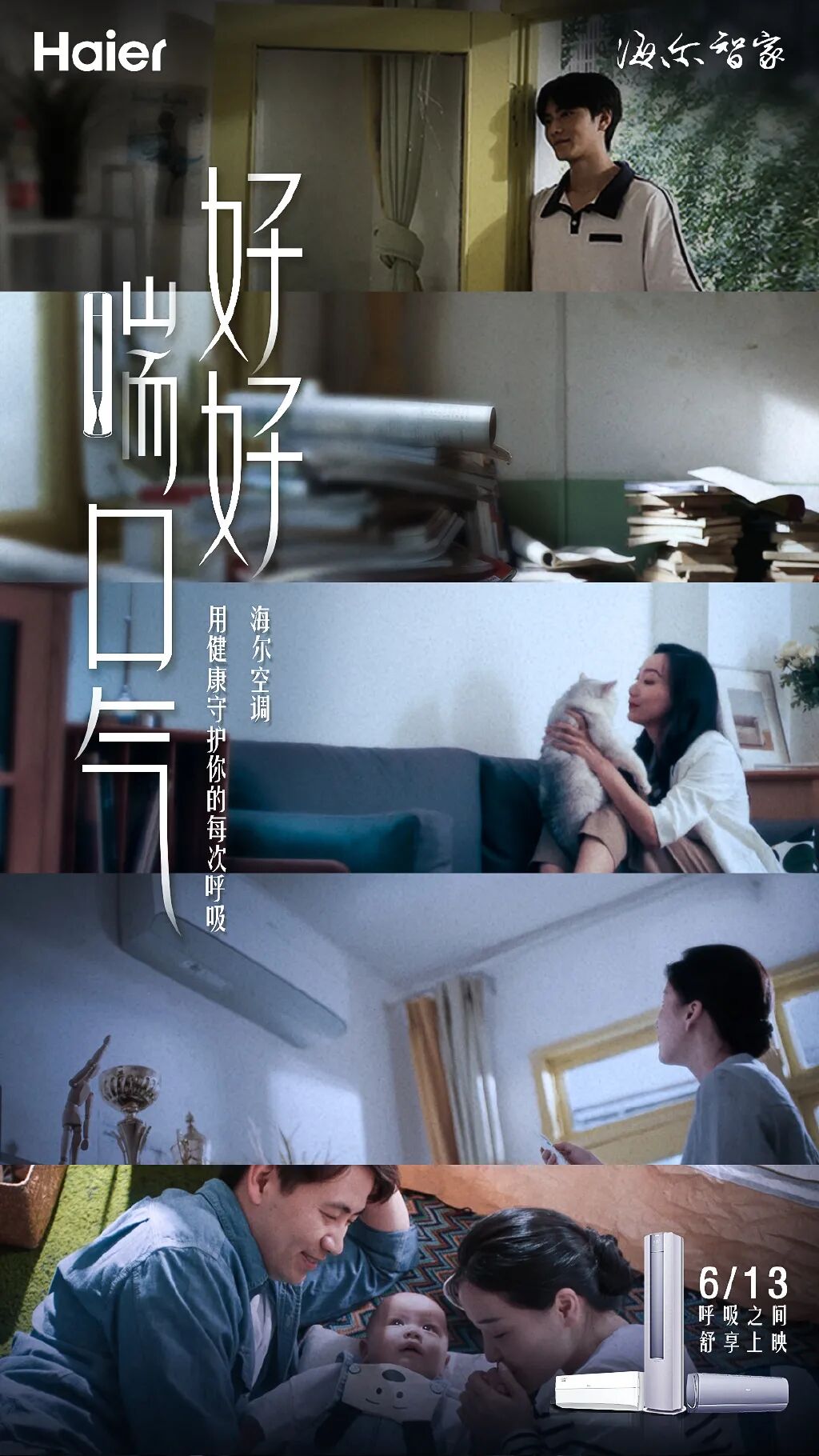 海尔空调一支《好好喘口气》短片,把镜头对准忙于复习的高考生、刚刚晋升的营销总监,新手爸妈这三大人群,将他们各自不能喘气的原因展现得淋漓尽致,看完不自觉地代入自己。