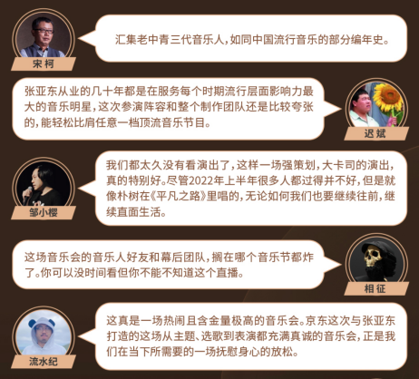关于这场京东晚八点音乐会,张亚东这个名字的出现,立刻就成为了内容品质的强背书。伴随着更多预热传播信息的释放,用户惊喜地发现,完整阵容比想象中更强大,正如活动副标题“张亚东和老友的歌”,这场音乐会可以说是一场大型的“张亚东朋友圈”聚会!在音乐会的策划方面,艺术总监由金牌音乐人推手、内地娱乐行业领军人物袁涛亲自担任,原太合麦田创始人宋柯、著名音乐人/简单生活节创始人贾敏恕也作为智囊参与其中,让这场音乐会的概念更加丰满。