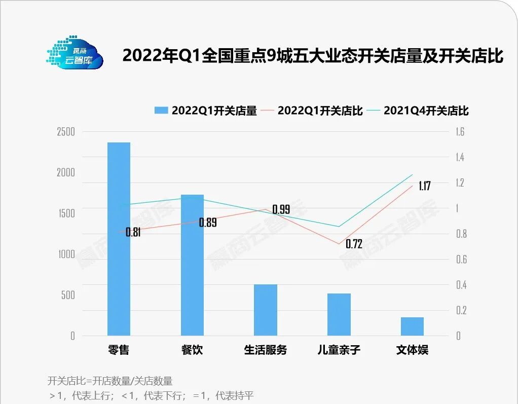 其中,零售、餐饮、儿童亲子三大业态的开关店比收缩明显。聚焦到餐饮板块,2022年一季度开关店比为0.89,相较于2021年四季度大于1的开关店比,有不小的收窄。