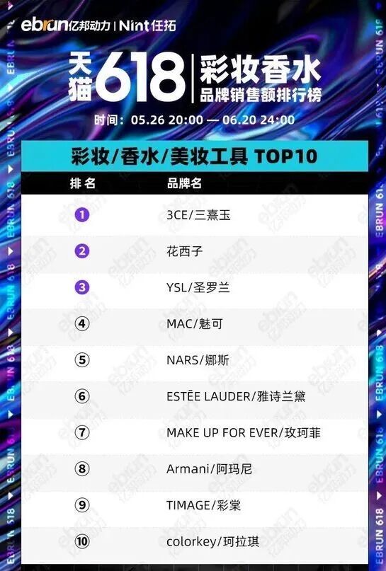 而在Nint任拓所统计的天猫618彩妆香水类目销售额榜单中,国际大牌占据着绝对优势,本土品牌仅有花西子与彩棠入榜。