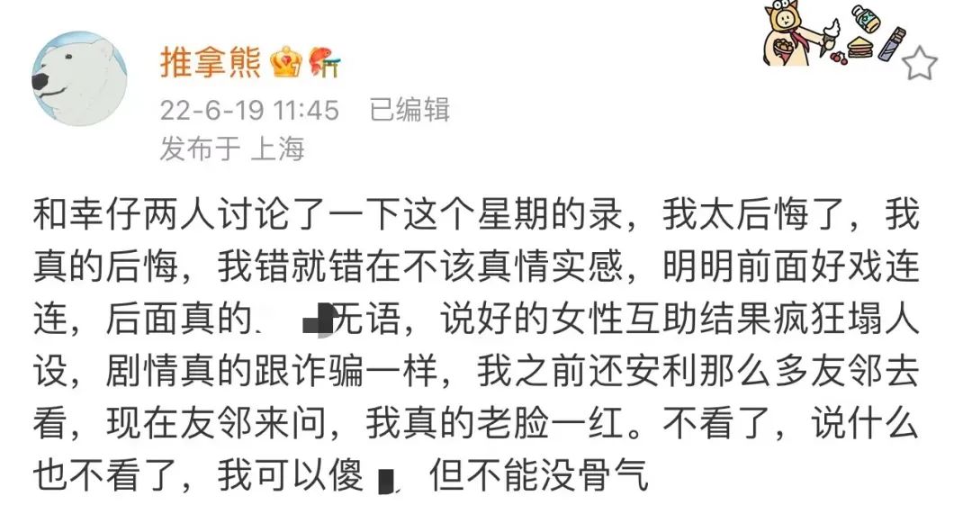 有网友随即评论:“当至少有一个女性在幕后工作中处于掌权地位,你就会在屏幕上看到更多的女性角色,甚至能看到一个不同的女性角色,一个更加强大的女性角色。”然而,爆红的同时,质疑之声紧跟而来。剧集播出十几集后,艺伎张好好“以色侍人才叫贱”的台词、男女主的“双洁”设定,令这部剧的口碑瞬时反转。