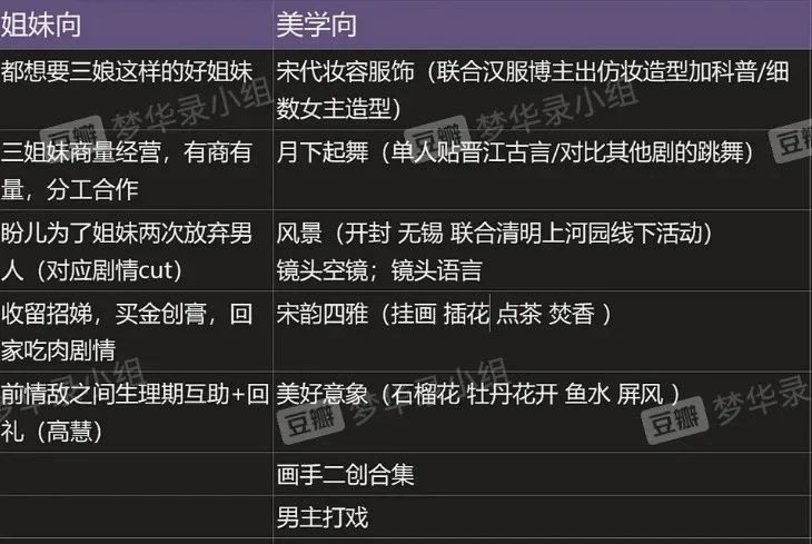 《梦华录》越播越火,其中有营销的发力,有自来水的助推,也有舆论反转后批评言论的二轮发酵。播出早期,在豆瓣清一色打出高分的网友,盛赞这部剧“尊重了我的眼睛,其次尊重了我的智商”,不失为内娱古偶天花板。溢美之词不绝于耳,简单来看,主要的观点大致集中在三个方面:刘亦菲的颜值、“顾盼生辉”的感情戏,这部戏对女孩的意义。颜值上,无需多谈。公众号“Sir电影”发文《这次刘亦菲可不是随便美美》,轻松斩获10w+阅读,文章提到,刘亦菲饰演的赵盼儿勾引周舍那一场戏,“罗扇轻抵时的调笑,倚门而立时的魅惑,自带万种风情。别说老赌徒周舍,柳下惠来了可能都得喊一句‘马上去休’”。感情戏上,豆瓣网友“不潜水不舒服”将赵盼儿与顾千帆的结合称为“具象化的月亮与行路人”,获得上千网友点赞。赵盼儿与顾千帆,“一个是为他倾听,为他温柔,永远安定皎洁的月亮,一个是疲于奔命,终于可以停下来歇一歇的行路人”。公众号“ONE文艺生活 ”在《乡野村妇刘亦菲,平平无奇〈梦华录〉》一文中表示,《梦华录》把成年人爱情里千回百转的幽微心理,慢慢铺陈给观众看,已经足够称得上是一出好戏。 对于剧中情感表达,微博网友“皈音”发博“女导演真好啊”,认为女导演才能体悟到女孩的不容易,为孙三娘(柳岩饰演)设计出“把男人扔在水里”的情景,获得114万点赞。