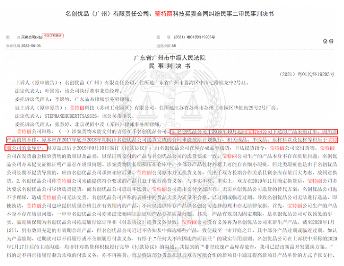 根据相关判决书显示,名创优品曾经向莹特丽下达了睡眠面膜等产品的采购订单,但因为销售不佳,原本在2017年底到2018年之间就应该提货完成的合同,却从莹特丽公司生产备货之后一直没能执行。