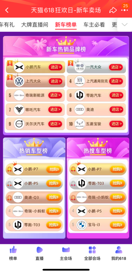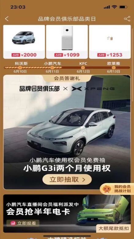 小鹏汽车深度挖掘高价值用户消费需求,联合天猫“品牌会员俱乐部”品类会员日,汽车行业唯一入选品牌,收获千万级曝光的同时,专场资源助力当日直播场观增加25%,有效吸引精准用户进入直播间。同时,配合天猫互动城强势引流,蓄水大促人群,拉新量150万+,粉丝会员增量2.5W。