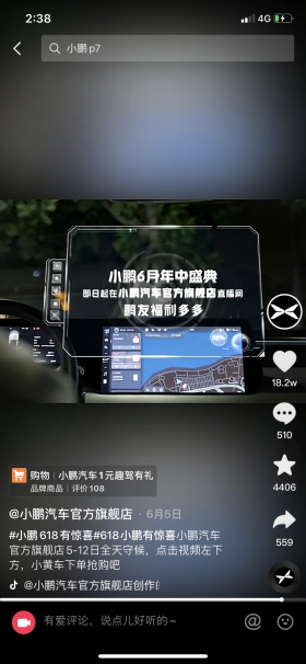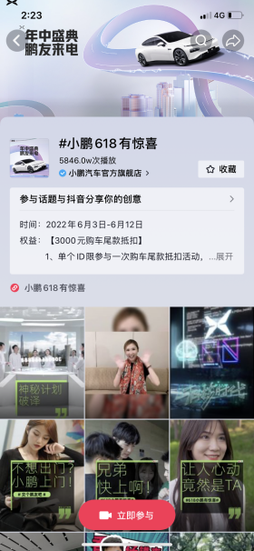 并与抖音平台联动,发起“618小鹏有惊喜”全民带货挑战赛,通过全民带货任务,联动汽车、科技、旅游等垂类及跨界达人,产出海量#小鹏618有惊喜#精品素材,席卷公域及私域,曝光量超1个亿,掀起站内风潮。