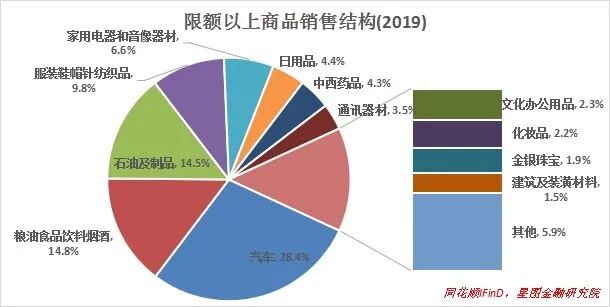 从限额以上商品结构来看,汽车类占比最高,达28.4%;其次是粮油食品饮料烟酒,占比14.8%;石油及制品(14.5%)、服装鞋帽针纺织品(9.8%)、家用电器和音像器材(6.6%)依此居后。