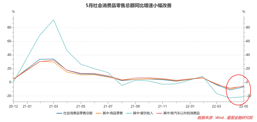 就2022年数据来看,受疫情影响,4月和5月社零销售额分别同比下滑11.1%和6.7%,5月数据环比修复,但仍未回正。