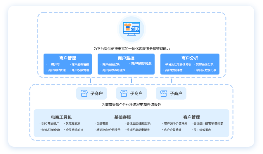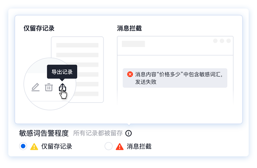 腾讯企点基于自身多年的社交服务基础和交付实践经验,为平台主提供平台级商户管理、会话记录、实时消息监控、敏感词拦截等服务,同时帮助平台主实现对商家的敏感词等管控,实现平台级一键管理。