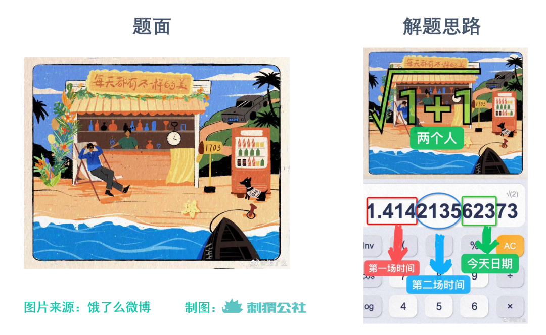 第三天,虽然题面仍是一张手绘图,但解题难度陡增。画面上与时间相关的数字,都一一被验伪,众多干扰信息包围下,不断有人在自认为对的时间下单,最终失意而归。直到当日第一场免单结束,用户才逐渐反应过来,免单时间与画面中形似根号的绿植有关。