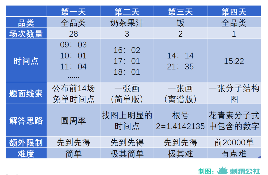 到第四天,场次继续收缩为一场,题面是一张分子结构图。很快有人认出,图中的物质是青蒿素,而青蒿素的分子式是C15H22O5,并以此猜出免单时间是15:22。在这天,免单活动首次公布当日单场免单总量为20000单。