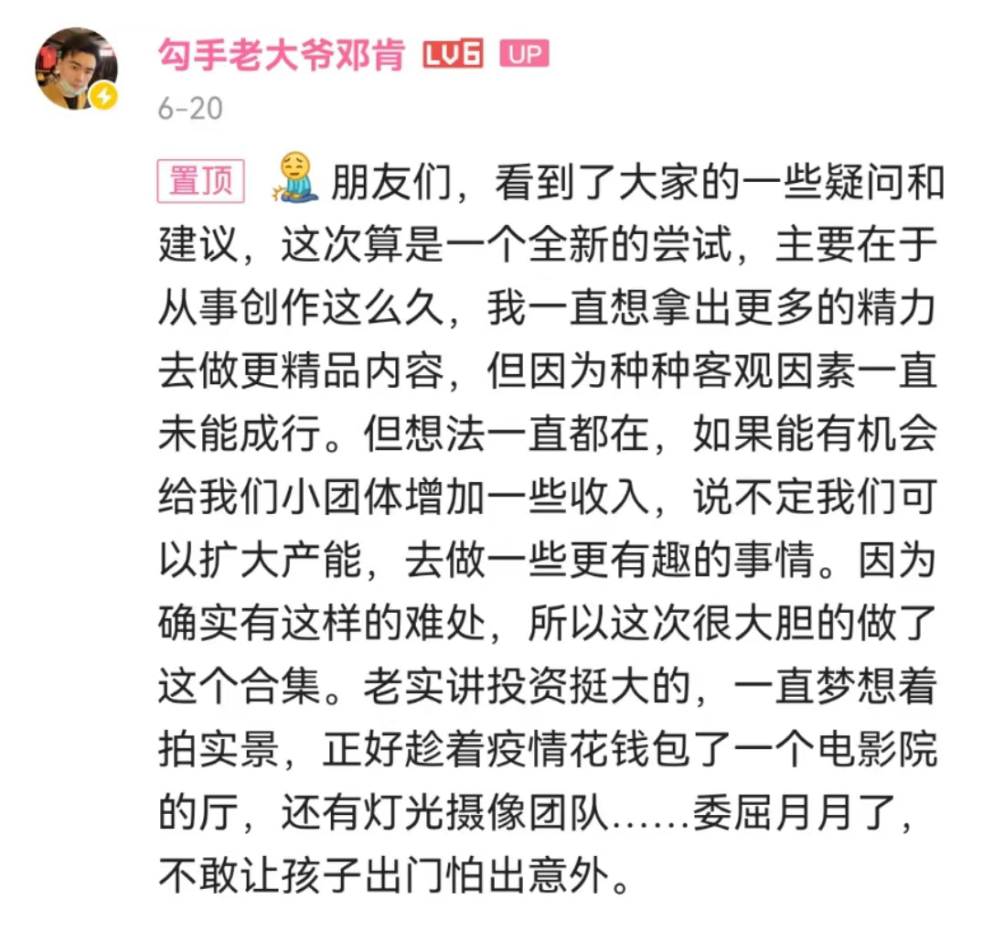 “大家好,我是邓肯,我要做付费内容了,第一张付费内容是解说世界十大未解之谜”。6月20日,B站UP主“勾手老大爷邓肯”率先推出了付费视频合集。在B站APP上的视频页面显示,该系列共有10集平均每个视频需要花费3元,合集需要付费30B币,也就是30元人民币。目前付费系列第1集的播放量已经达到了2.7万次。作为B站上的第一个付费系列合集,该视频一推出之后就引起了网友的热议:有不少人认为售价偏高,还有人认为付费后发现自己早就听过这个故事。当然,邓肯发布了付费视频之后,网友最集中质疑的依然在于内容本身。如电影电视剧是版权付费,课堂是知识付费,但一个网上都有公开资料的过往案件解说,也有其他UP主做过讲解,为什么就能收费30元?面对种种质疑,UP主邓肯也回应表示:“算是一次全新的尝试,如果能够有机会给小团体增加一些收入,说不定我们可以扩大产能,做一些更有趣的事。”事实上,不只是勾手老大爷邓肯,如程序员、摄影师等UP主也相继推出了付费合集,粉丝数从几万到几十万不等,定价也有所区别。要知道,最初B站一直都是靠着不加广告、不收费等各种福利才从爱优腾等巨头垄断的视频领域中突出重围。对很多用户来说,B站几乎等同于是个“用爱发电”的福利平台。只是随着平台的进一步壮大,B站抛弃了此前的设定,推出付费大会员制度。大会员制度实际上也得到了很多用户的理解,毕竟不少人一直都很困惑B站到底是怎么赚钱的?用会员费来维持网站运转算是有效方法之一。02