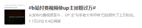 就在6月24日,#B站付费视频使UP主掉粉过万#的话题冲上了热搜榜第2位。短短一个小时内,阅读量就达到了1.7亿次。据了解,这是B站最近所上线的付费观看UP主视频内容的功能。6月20日B站UP主“勾手老大爷邓肯”上传了世界十大未解之谜系列视频,成为了B站首个付费视频合集。只是30元10集的售价引起了网友的热议:有人认为价格太贵,看一部电影30元也够了;也有人认为B站的吃相太过难看,明明都已经是大会员了,这些视频还要单独付费才能观看,就是在“割韭菜”。从目前该付费视频2.7万次的播放量来看,视频合集销售额已经突破70万,但UP主邓肯的粉丝反而还掉了1万多。01