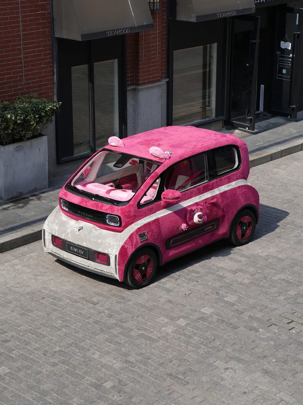 3月,五菱旗下的宝骏微型电动车KiWi EV,宣布和迪士尼经典IP草莓熊展开梦幻跨界,推出了粉色系的“毛绒草莓熊车”。