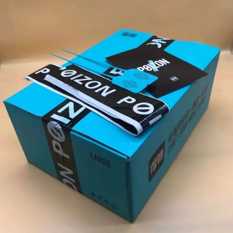 消费者在“毒”平台购买商品后,收到的快递外包装都带有“毒”的标识。颜色也进行了调整,原来鞋的外包装是棕色,衣服和饰品包装为黑色,但这似乎并不那么瞩目。此后,平台将所有快递外包装统一调整为更为鲜艳醒目的湖水蓝。