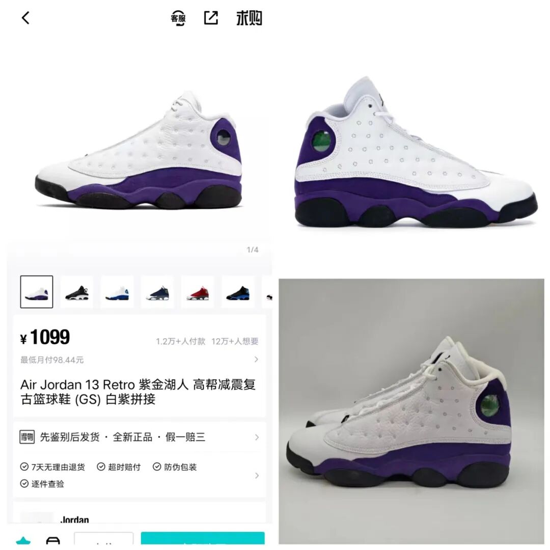以图中款鞋aj13 court purple gs为例,左侧男款鞋型的流线型更加完美,右侧两图的gs版则相对臃肿,仅外观的差异就会对消费者造成误导的效果。更何况这些销量都是在得物平台上销售过几千甚至上万双的鞋款,一个专业平台存在配图错误,不禁令人疑惑。
