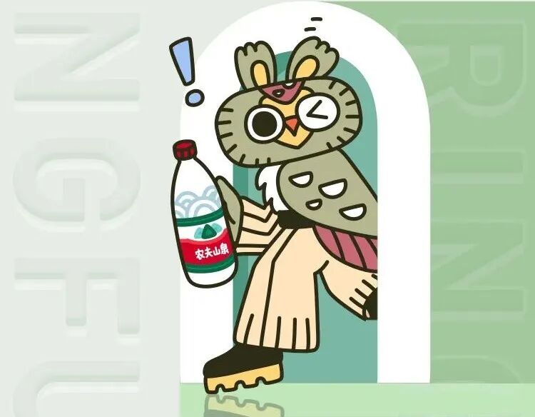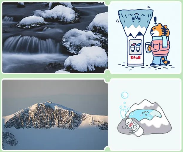 甚至是将山泉、水的形象进行拟人化,结合农夫山泉产品设计。以亲切可爱的画风传达产品良好的质量,更加通俗易懂。