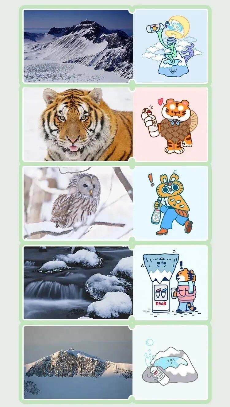 就如前面介绍所说,数字藏品包括画作、图片、音乐、视频等各种形式呈现。农夫山泉这次推出的数字藏品,则是设计了1000款插画,并且是以和品牌紧紧关联的高山、湖泊、东北虎、猫头鹰等自然元素为灵感。