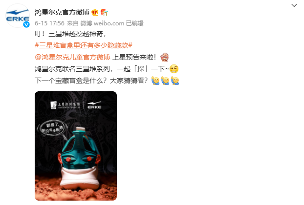 鸿星尔克与三星堆携手联名推出三星堆系列新品,利用了三星堆被广泛关注度以及受欢迎程度。品牌在微博发布跨界联名新品话题,通过观众好奇心及一探究竟的心理,引起他们关注,为联名造势。
