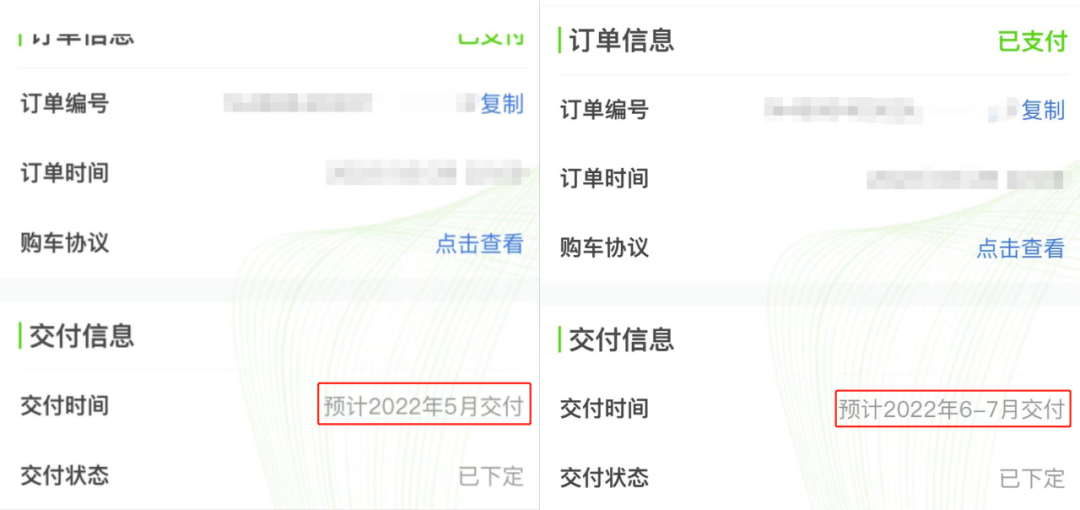 当时门店销售向他介绍,下定这款车型预计提车时间会在2-3个月。“当时听完这个提车时间后,推算下大概在今年2-3月就能拿到车还是比较满意的,于是就很快下定了。”苏鹏这样回忆道。