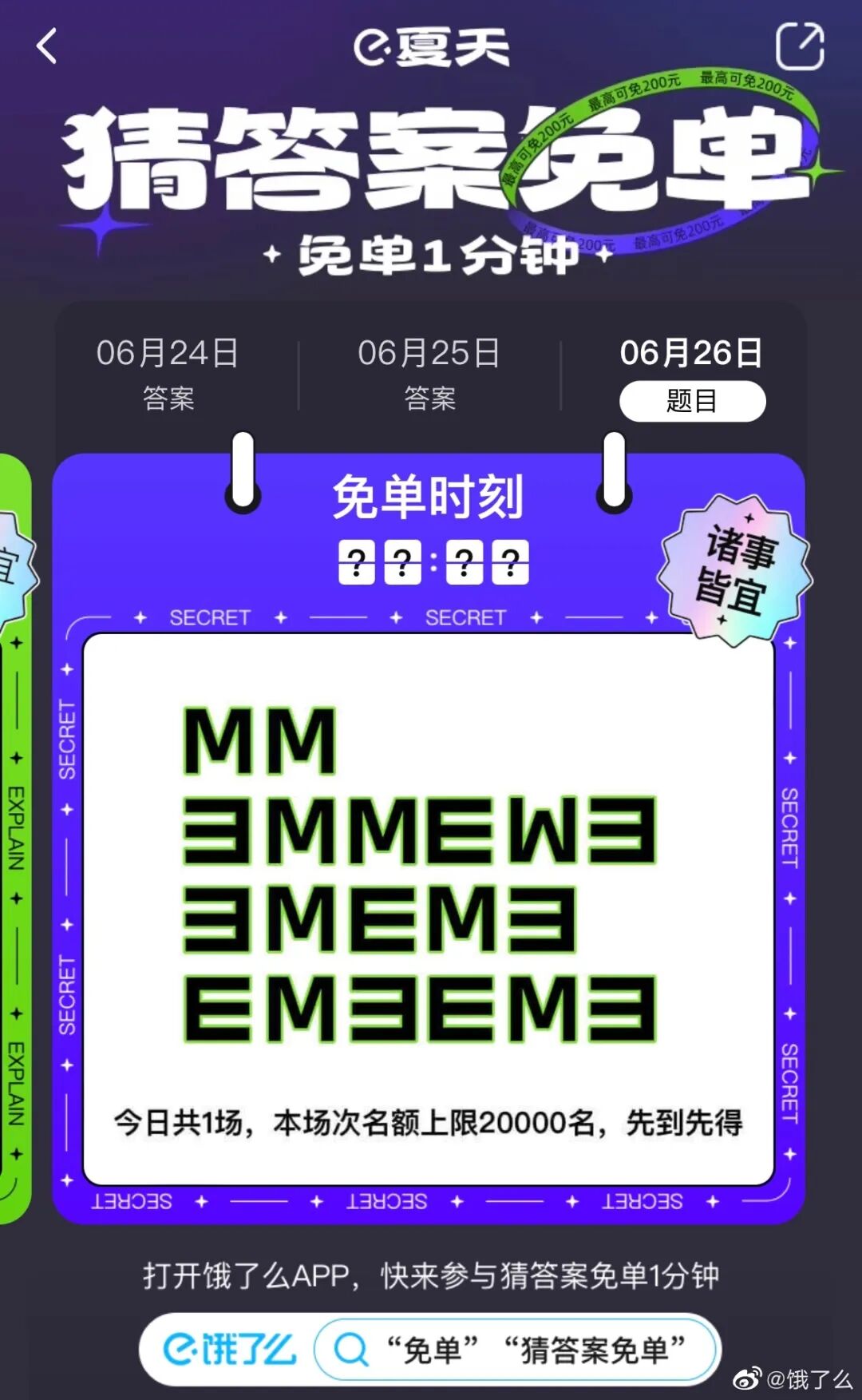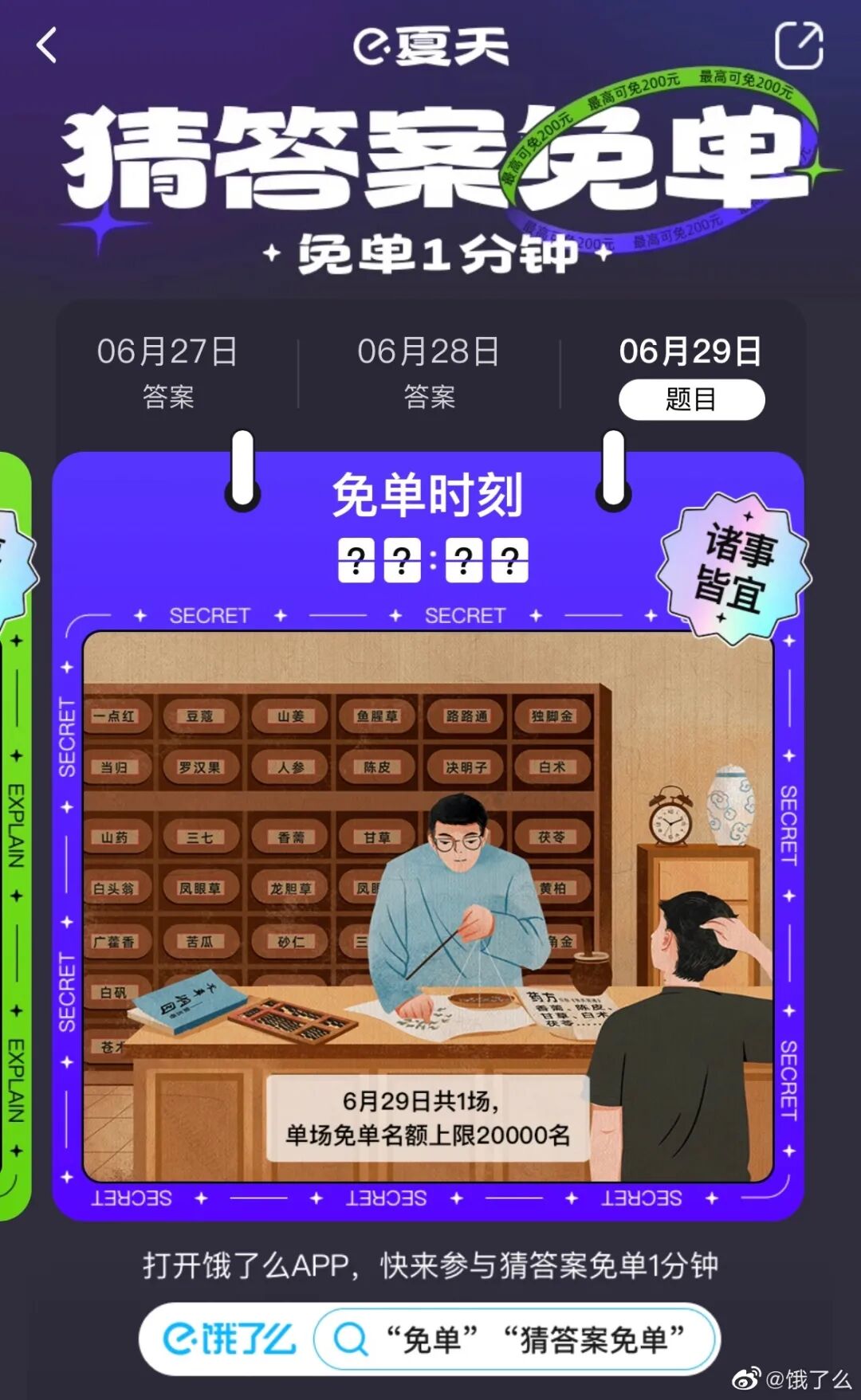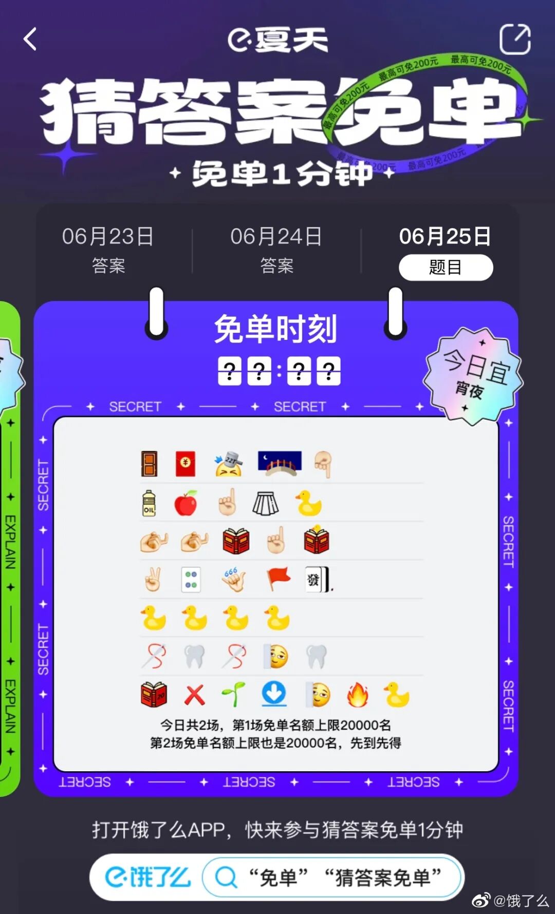 最近,#饿了么免单#多次登上热搜,并在各个平台上刷屏,引发不少网友使用饿了么下单。免单设置具有随机性,「猜题点外卖,才对享免单」。用户需根据线索猜中免单一分钟的时间,同时在指定时间下单,就可以获得免单。点评:饿了么此次营销把消费者的博彩心理拿捏的死死的,靠用户口口相传迅速发酵。不仅激活了老用户,也成功拉新了一波新用户。06