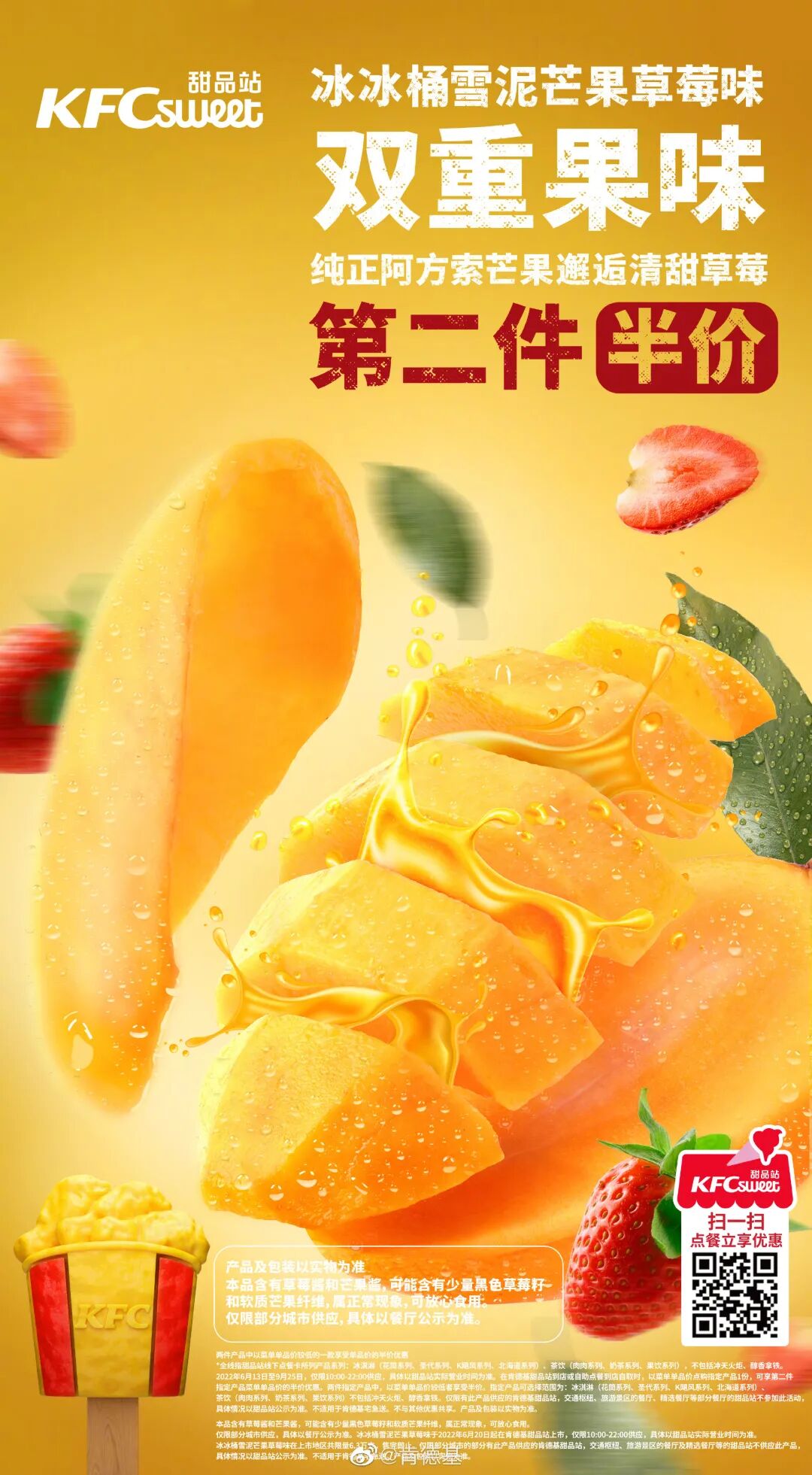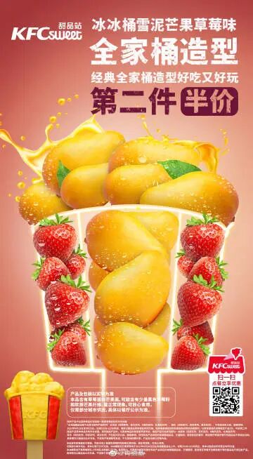 最近,肯德基推出了首款全家桶造型雪泥。「冰冰桶雪泥」作为史上最小桶、三口就能吃完,以15元的身价成为雪糕刺客的一员。这是肯德基史上第一次卖「巴掌炸鸡桶」,芒果和草莓的双拼撞色很KFC。虽然小,但是完美复刻了炸鸡桶的形状,配上KFC的经典logo,红+黄经典配色,连桶都能吃掉。点评:肯德基借势雪糕刺客这个热门话题,用花式营销+出人意料的新颖创意吸引大家注意力,实现品牌声量+流量双丰收。03