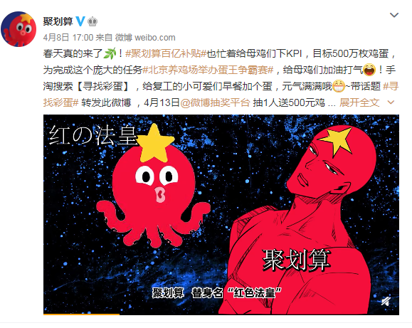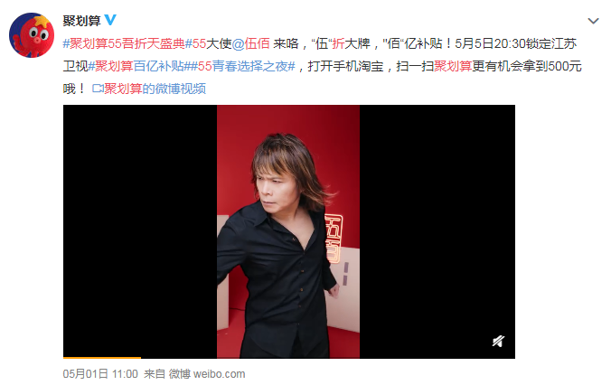 不免让我想起了5月初聚划算邀请伍佰为「聚划算55吾折天盛典」推出的一支价值“500元”的魔性预热广告;4月初推出的趣味“蛋王争霸赛”魔性视频。