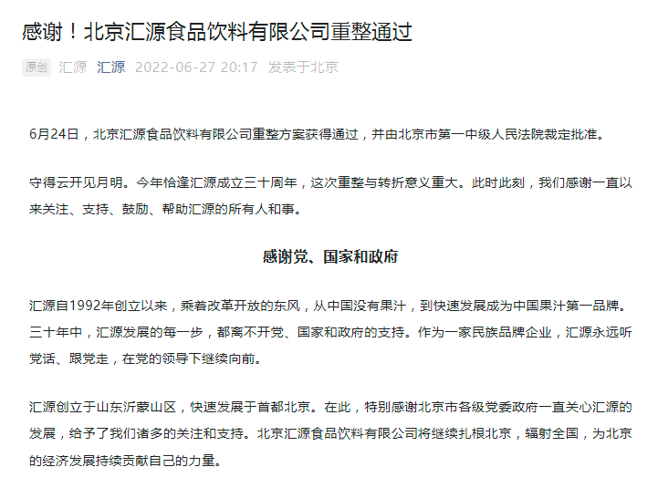 对此,汇源用“意义重大”来形容这次重组方案的通过。公告当中汇源表示恰逢成立30周年,这次重整与转折意义重大。未来将会继续扎根北京,辐射全国。