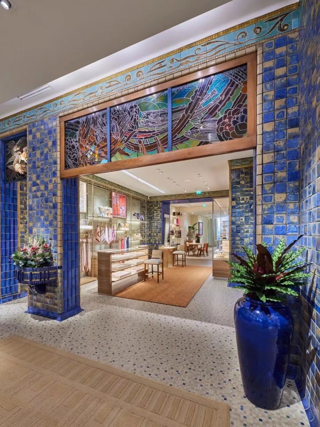 而门店内,随处可见LV品牌的标志性元素。比如仔细看的话,可以看到四瓣花花纹形状的绿色藤条。