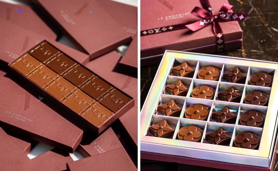 巧克力的形状或设计成品牌标志性的四瓣花纹,或印上LV的LOGO。
