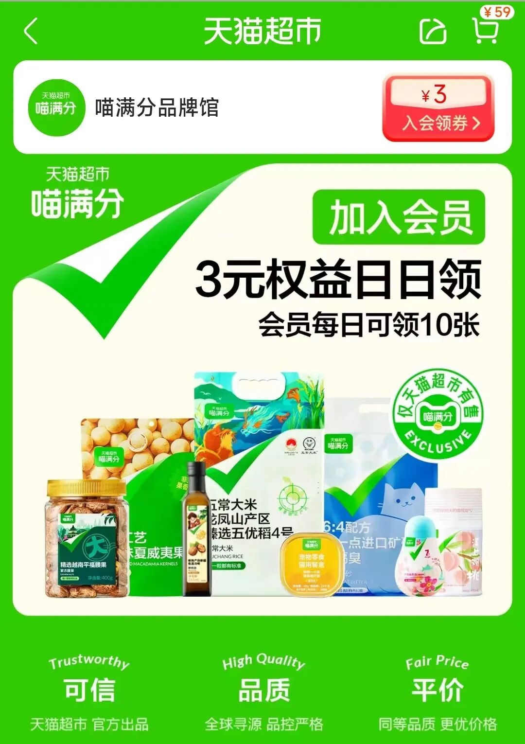 由心选而生的喵满分,喊出了“可信、品质、平价”的口号,主要聚焦在宠物用品、粮油米面、坚果零食及家清洗护四大类目,并宣称“天猫超市独家商品”。