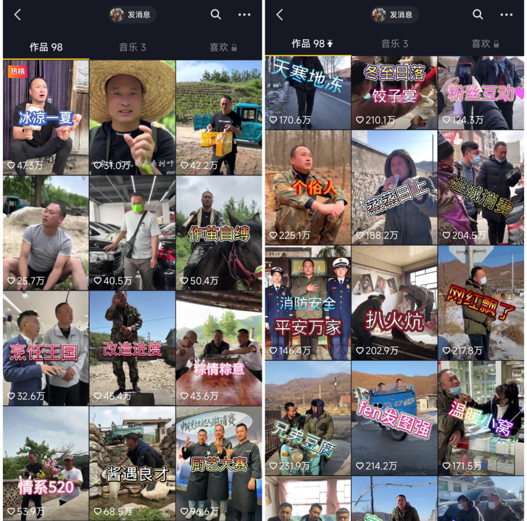 此外,早期的@张同学 在视频里更多是记录自己起床、喂狗、喂鸡、上山砍柴、跟朋友吃饭喝小酒的乡村生活日常,现在其作品里开始出现越来越多新的面孔,场景也逐渐丰富起来,但故事却难免落入了俗套,变着花样做起了美食。