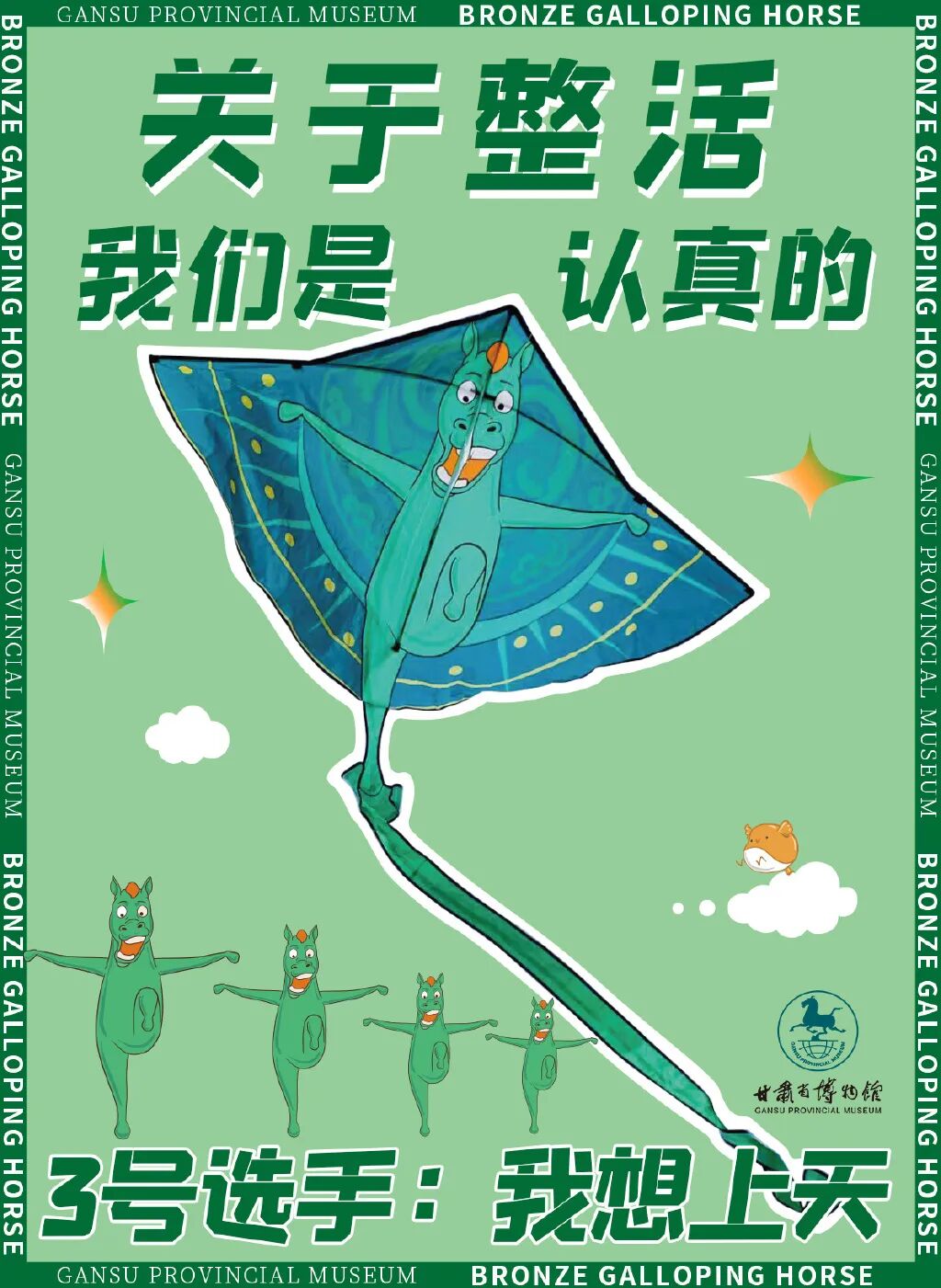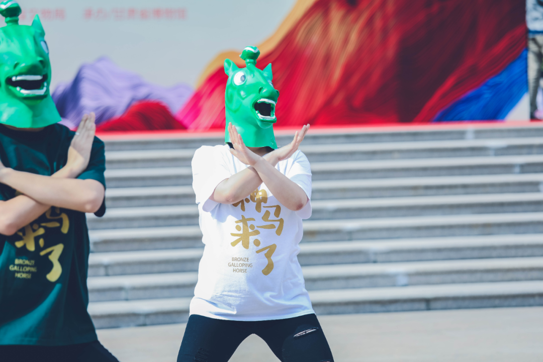 同样是抓住“铜奔马”正面自带喜感的特点,在尊重文物原型特点的基础上,设计出这款3D马头造型的“绿马头套”,并创意编排了一组“神马舞”同步亮相。
