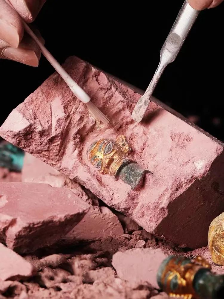 沉睡数千年,一醒天下惊的三星堆,自问世以来一直吸引着众多关注的目光。相比其他盲盒,三星堆盲盒的特色是更有仪式感和场景感,考古味十足。这款盲盒有意思的地方在于附赠铲子、锤子和眼镜,让你有真正的考古体验。