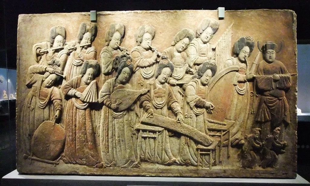 河北博物馆的墙壁浮雕,描绘的是唐代15个乐团仕女演奏的画面。而在商店,这15个乐团仕女,转身一变,成了女团c位出道!